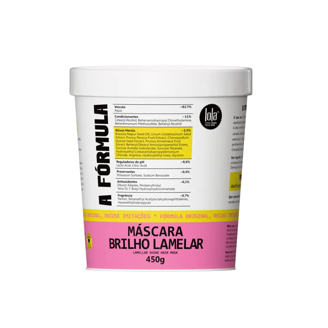 A Máscara Brilho Lamelar “A Fórmula” 450g é a versão econômica e de uso contínuo da inovadora máscara de retexturização da Lola Cosmetics. Utilizando tecnologia lamelar avançada, ela organiza as cutículas capilares para entregar um brilho quase espelhado e uma maciez extrema. Com quase meio quilo de produto, é perfeita para quem deseja manter o efeito de salão em casa, garantindo fios leves, sedosos e intensamente reflexivos por muito mais tempo.