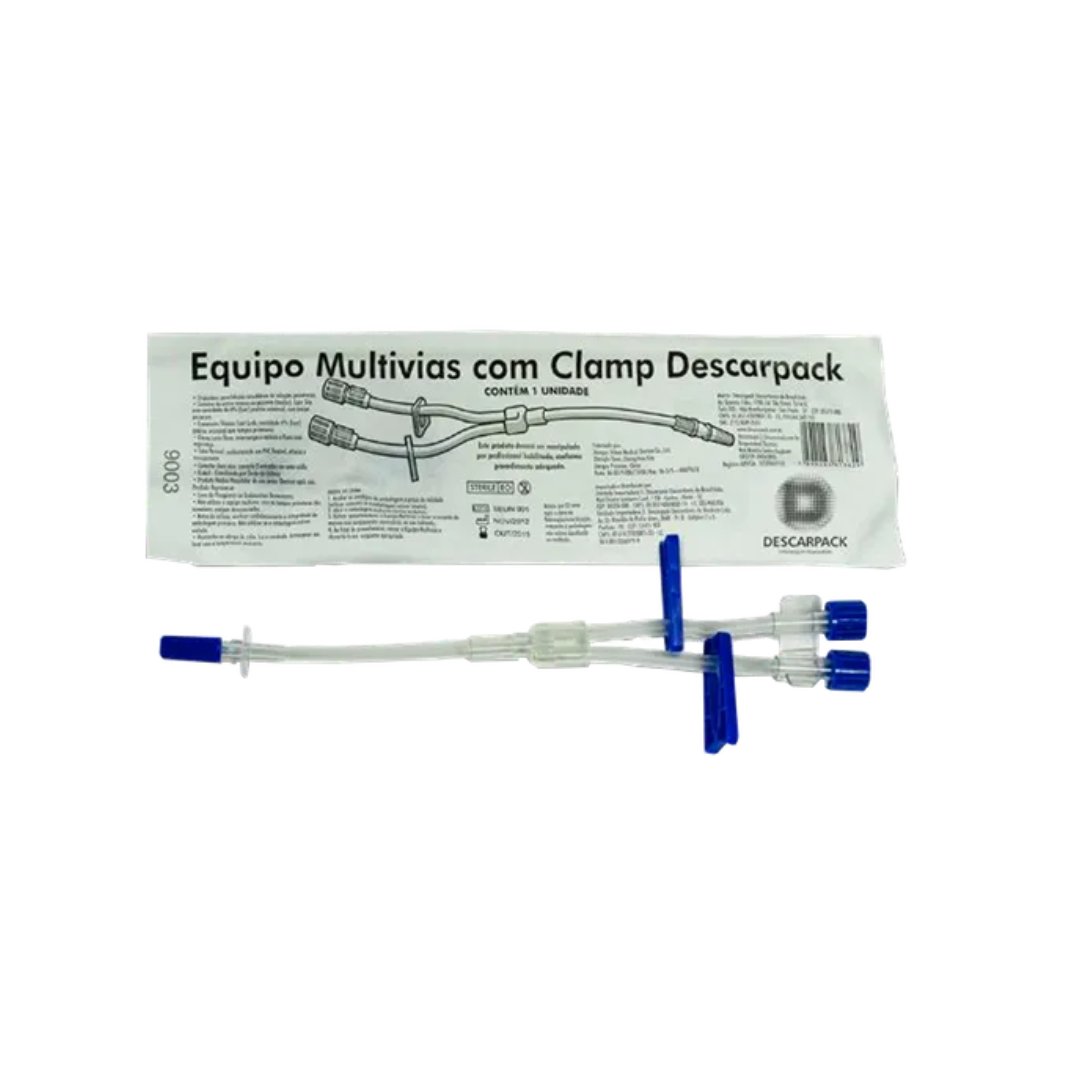 O Equipo 2 Vias Descarpack é um extensor de sistema fechado desenvolvido para duplicar as vias de acesso ao paciente. Equipado com Clamps (pinças corta-fluxo) em cada via, ele permite interromper ou liberar a passagem de líquidos individualmente sem a necessidade de desconectar o equipo. Fabricado em PVC flexível e transparente, é um item indispensável para a administração simultânea de medicamentos e soluções compatíveis, garantindo segurança e praticidade no ambiente hospitalar.