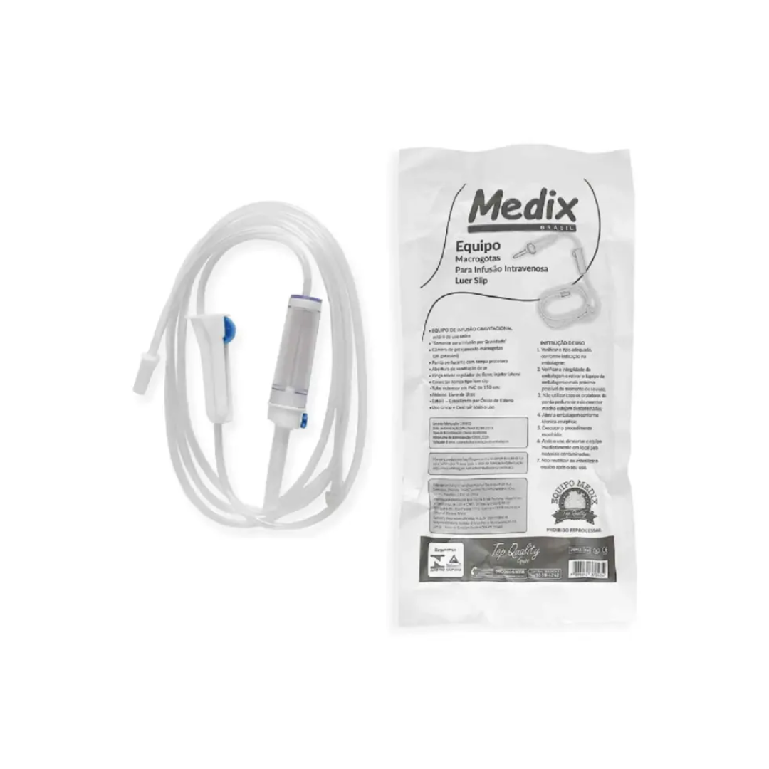 O Equipo Macro-gotas Medix é um dispositivo estéril essencial para a administração de soluções parenterais por gravidade. Este modelo conta com entrada de ar com filtro, que permite a vazão contínua do líquido em frascos rígidos, e injetor lateral, facilitando a aplicação de medicamentos durante a infusão. Com bico tipo Luer Slip (encaixe por pressão), oferece praticidade e rapidez no acoplamento, sendo fabricado em material atóxico e livre de látex para total segurança do paciente.