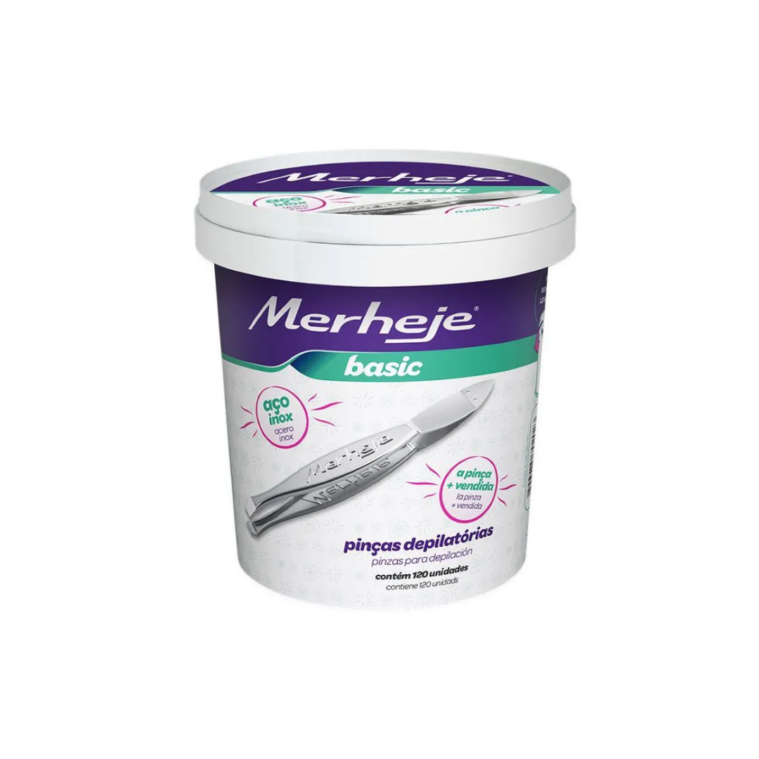 A linha Basic da Merheje é reconhecida pela durabilidade e praticidade. Ao oferecer o pote com 120 unidades, a marca facilita a exposição no balcão de vendas, estimulando a compra por impulso. Cada pinça é projetada para remover o pelo pela raiz de forma rápida, sendo um item essencial para a rotina de cuidados de qualquer cliente.