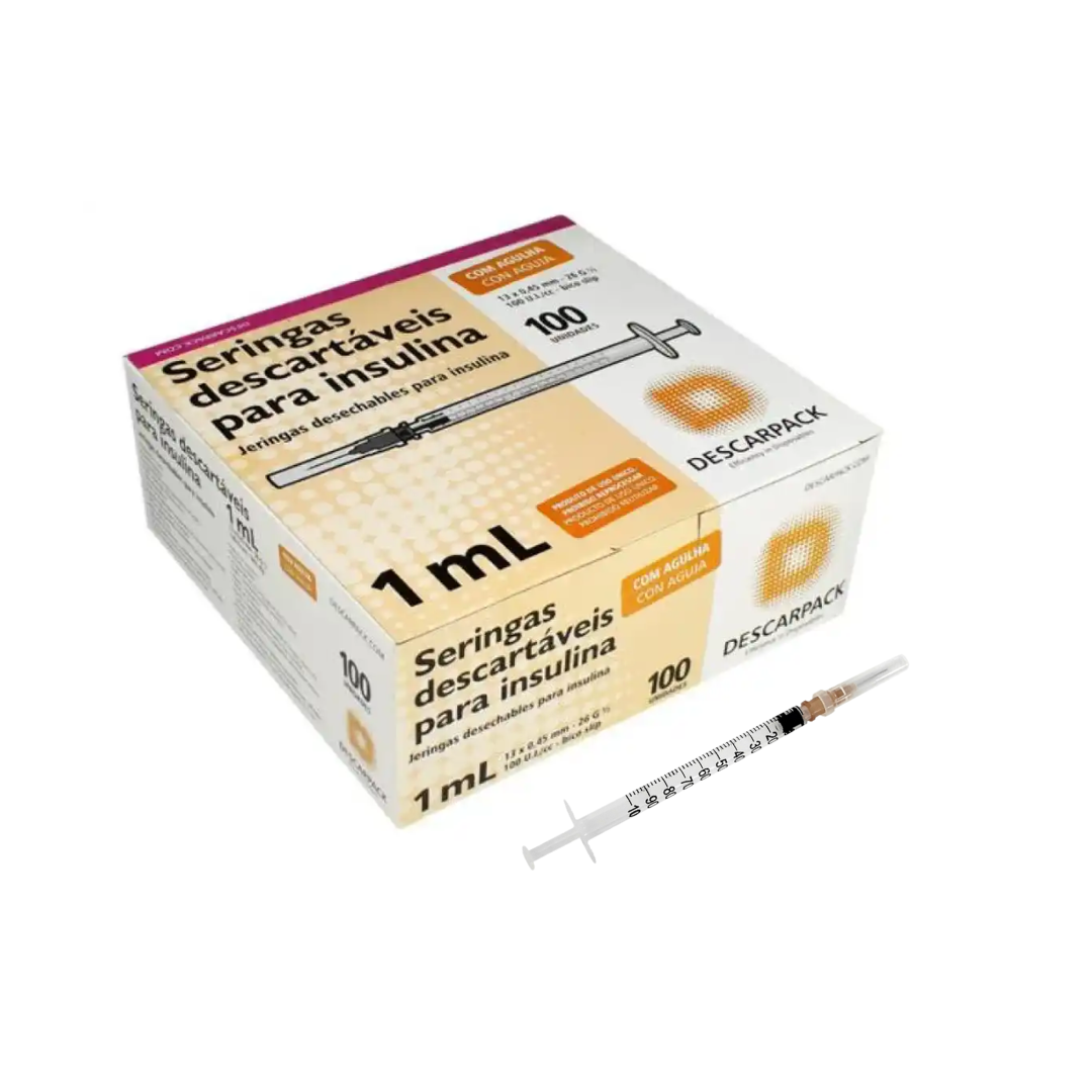 A Seringa 1ml Descarpack com Agulha 13×0,45mm é um dispositivo médico estéril de alta precisão, projetado para a administração de pequenos volumes de medicamentos. O conjunto já vem montado com uma agulha extrafina, ideal para aplicações subcutâneas e intradérmicas. Fabricada em polipropileno transparente com escala de graduação nítida, permite o controle rigoroso da dose, sendo amplamente utilizada em tratamentos de diabetes, testes alérgicos, vacinação e procedimentos estéticos.